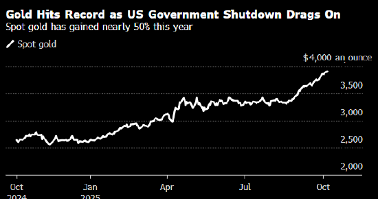 金价一度上涨至每盎司3920.63美元,随后回吐部分涨幅。美国联邦政府停摆导致原定于周五发布的美国就业数据推迟,使得本已不明朗的经济前景更加扑朔迷离。