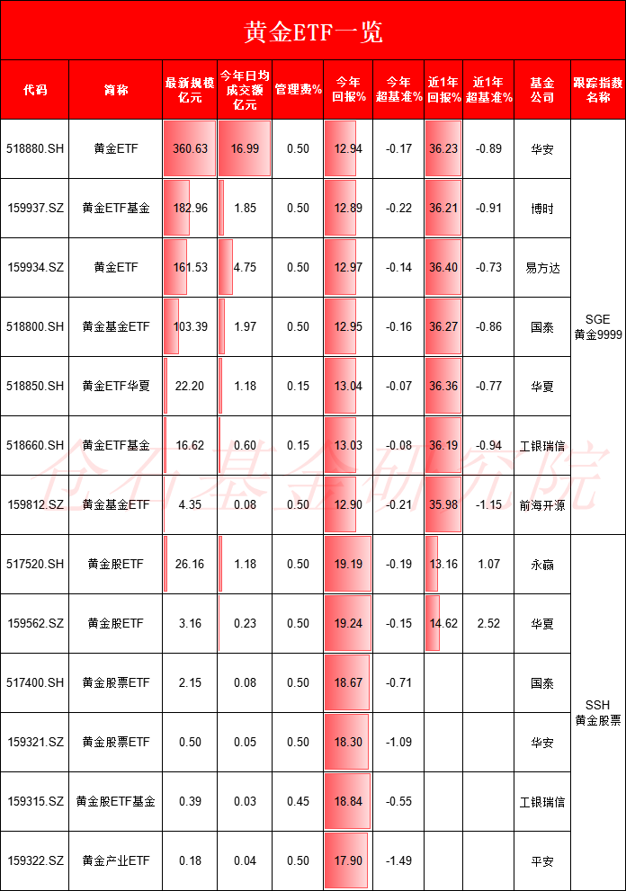 跟踪指数:8只跟踪SGE黄金9999指数,7只跟踪SSH黄金股票指数